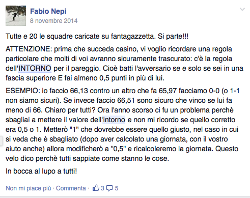 Stiamo ricalcolando le varie competizioni (Serie B, Serie A e Coppa Italia) perché ci siamo accorti di aver sbagliato ad impostare un parametro nel sistema di fantagazzetta. Più precisamente avevamo impostato 1, anziché 0,5 (come stabilito da regolamento) per l’intorno.