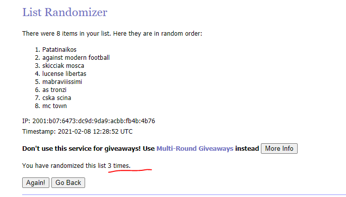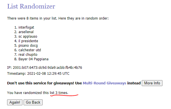 A seguito dell’estrazione su random.org del numero di volte indicato su whats app (3) ecco il risultato: