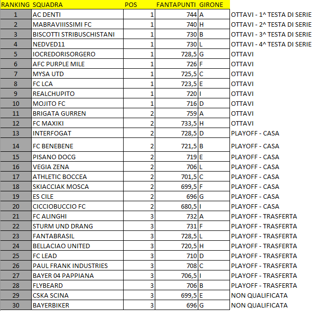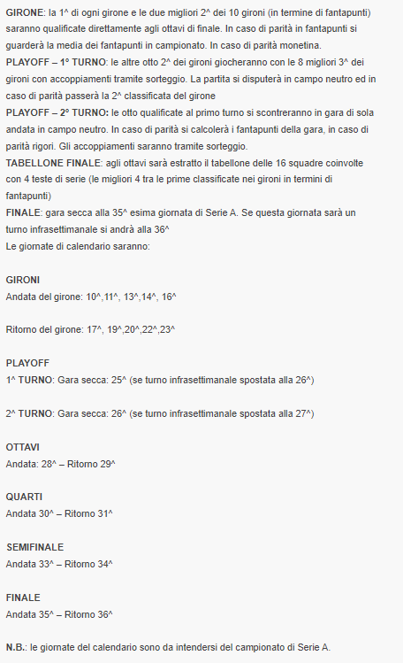 N.B.2: il 2° turno si giocherà in campo neutro ed in caso di parità si guarderà il fantapunteggio della giornata. In caso di parità di fantapunteggio avrà la meglio la squadra più alta in ranking mostrato nella 2^ immagine.
